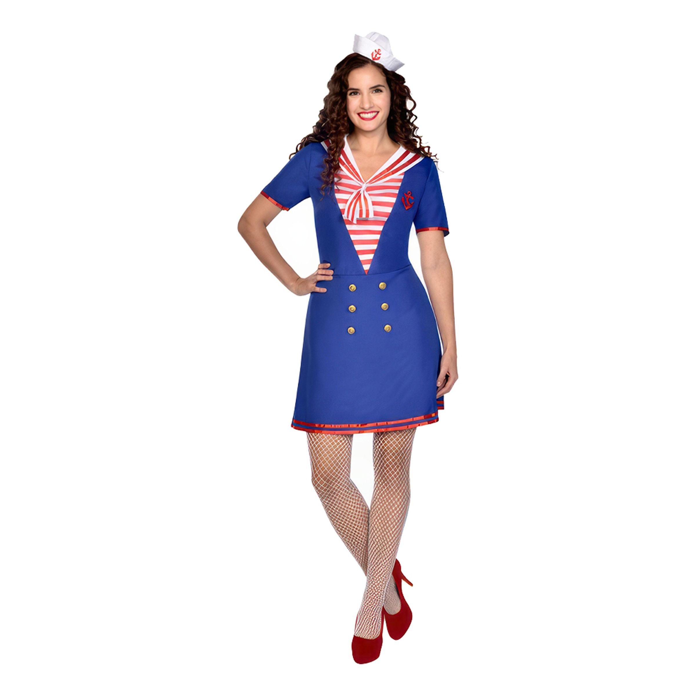 Sjömansklänning Maskeraddräkt finns i storlekarna Small, Medium, Medium/Large, Large, X-Large. Dräkten är tillverkad av polyester och kommer komplett med sjömanshatt.