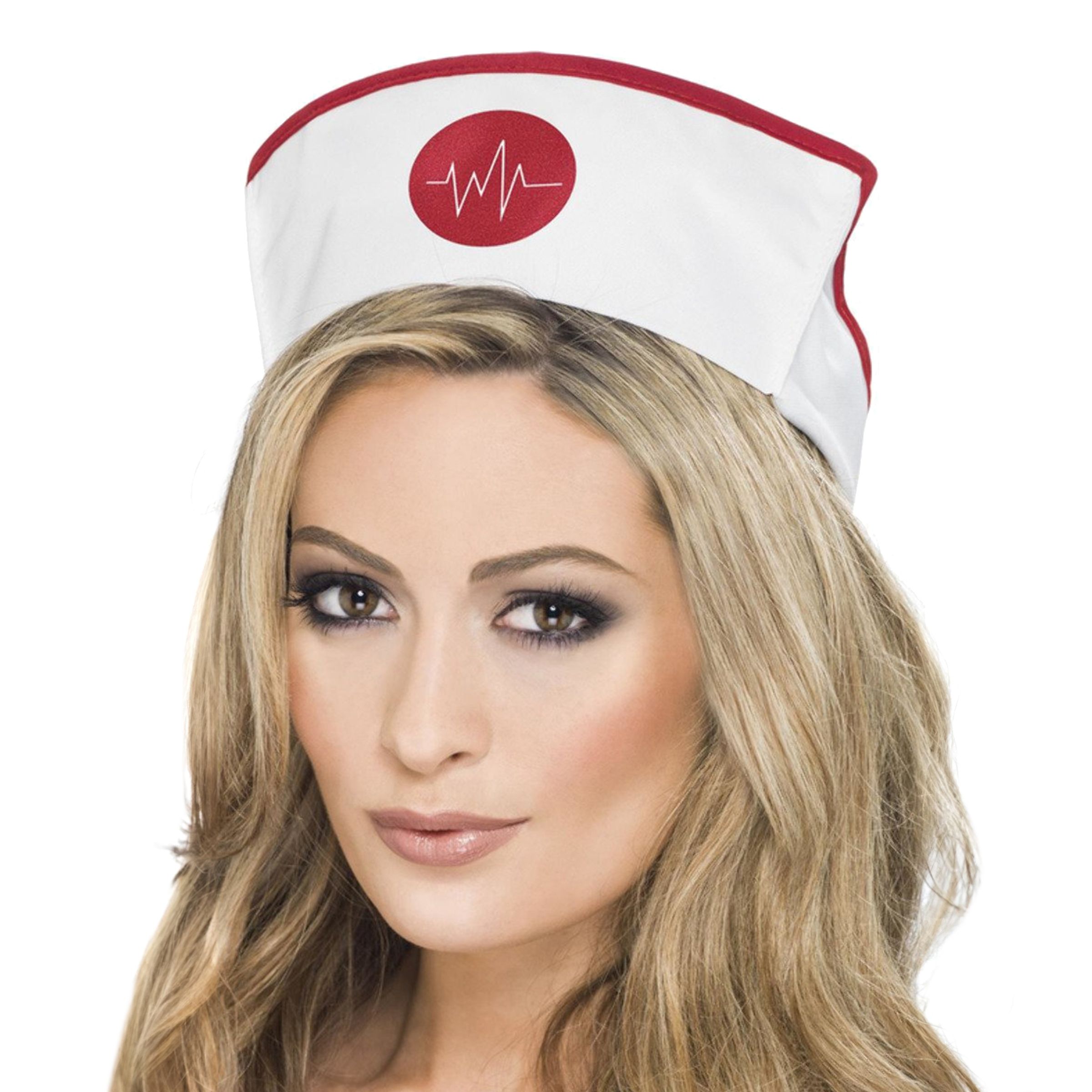 Sjuksköterskehatt är en vit hatt med en klassisk, styv form som viks upp längs kanterna. Den har en röd kantlinje runtom och pryds framtill av en röd cirkel med ett vitt EKG-liknande hjärtslagssymbol. Perfekt komplement till din sjuksköterskedräkt!