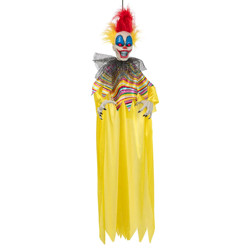 Skakade Clown med Ljud och Ljus omfattar en hängande clown dekoration med rufsigt gult och rött hår, läskig clownsminkning och en lång gul klädsel med randigt mönster samt nät-detaljer runt halsen. Clownen har skakande rörelser, lysande ögon och skrämmande ljudeffekter samt böjbara armar. Dekorationen är ca 100 cm lång och drivs av 3 x AA-batterier.