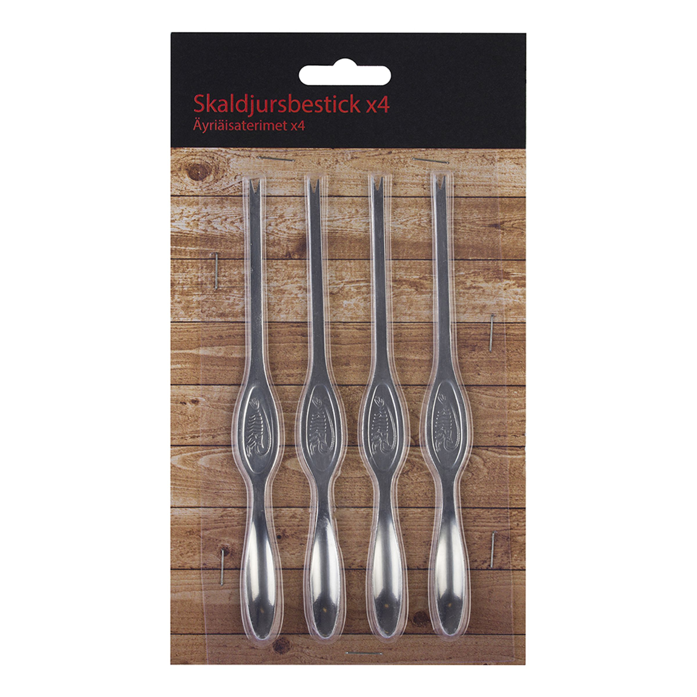 Skaldjursbestick inkluderar 4 stycken skaldjursbestick i rostfritt stål.