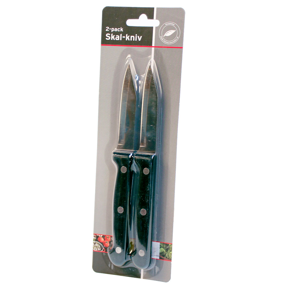 Skalknivar består av en kniv som passar att skära och skala frukt och grönsaker med. Knivarna mäter ungefär 19 centimeter långa. De är tillverkade i rostfritt stål med ett skaft av plast. Säljs i 2-pack.