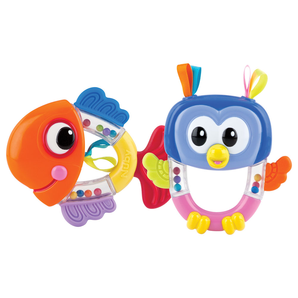 Din bebis kan utforska en värld av ljud och form med denna färgglada skallra. Perfekt som bitleksak för bebisar från 3 månader, erbjuder den spännande former av fisk eller uggla för nyfikna små att upptäcka och bita i.