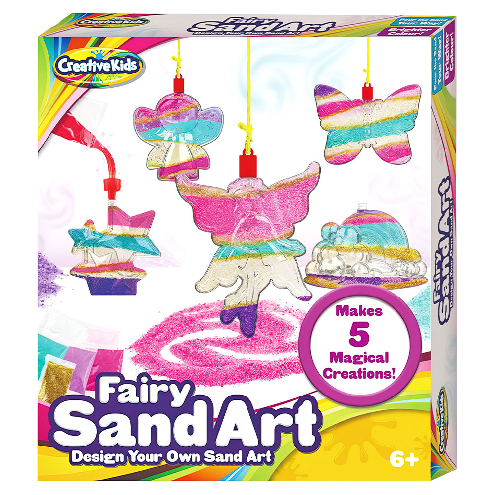 Skapa din egen sandkonst med sand i olika färger och glitter som du häller i dina figurers behållare, ett roligt pyssel som resulterar i magiskt snygga dekoration hängen med exempelvis fe, fjäril och stjärna att ha hängandes i fönstret, på ryggsäcken eller varför inte till jul i julgranen.