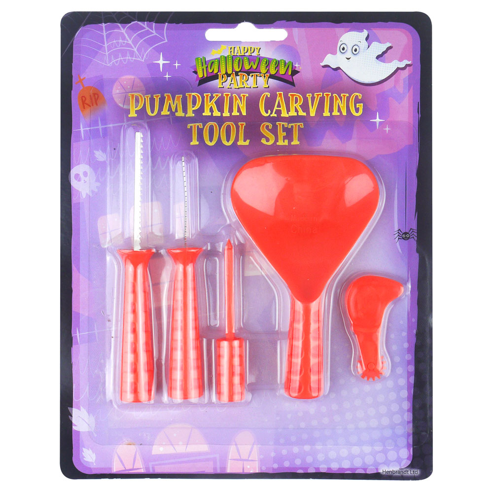 Skärset till Halloweenpumpor omfattar ett skärset för halloweenpumpor med fem olika verktyg av plast och metall.