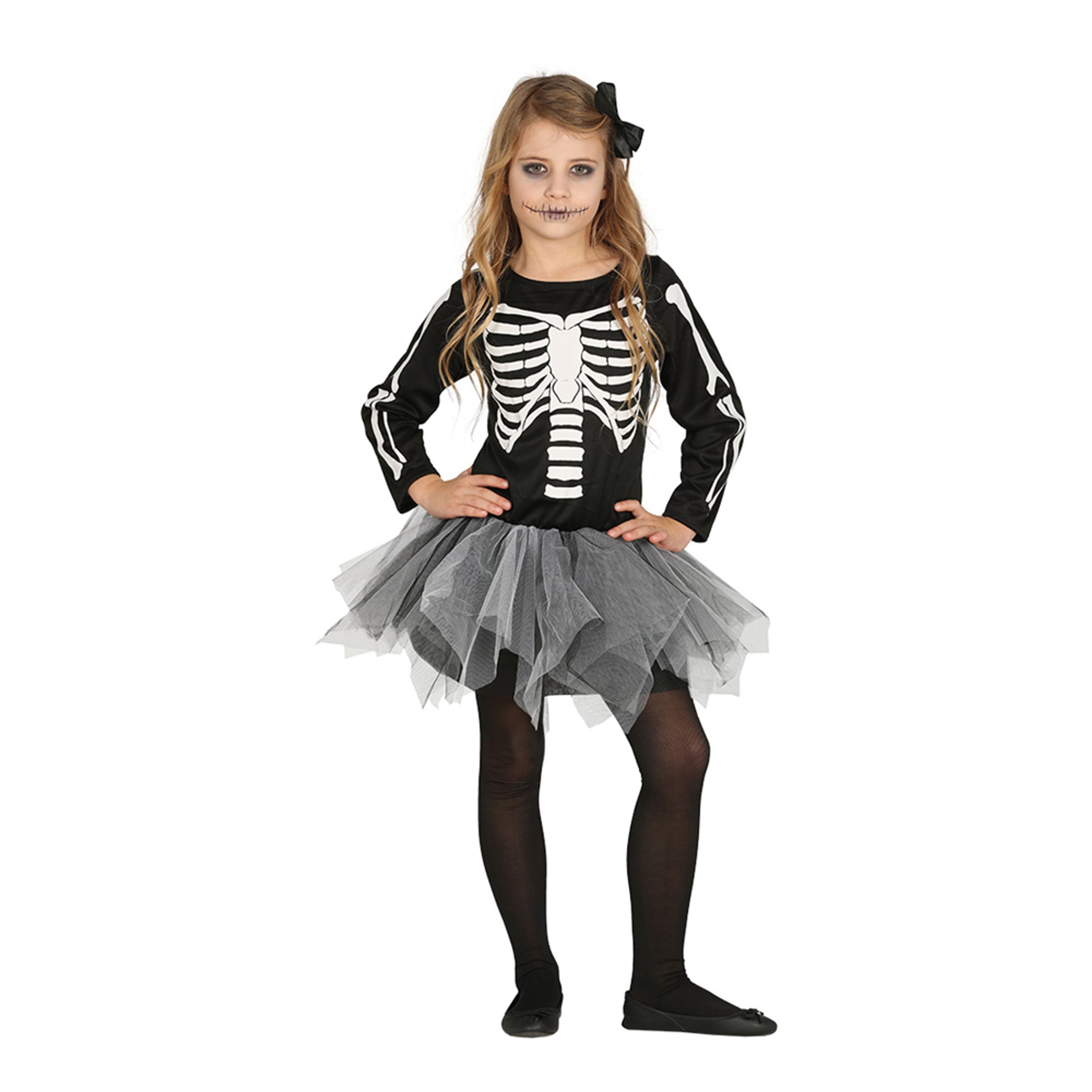 Skelett Barn Maskeraddräkt innehåller en tröja med skelett-tryck i polyester och tyllkjol. Finns i storlekarna Small (3-4 år), Medium (5-6 år). Byxor, skor och smink medföljer ej.
