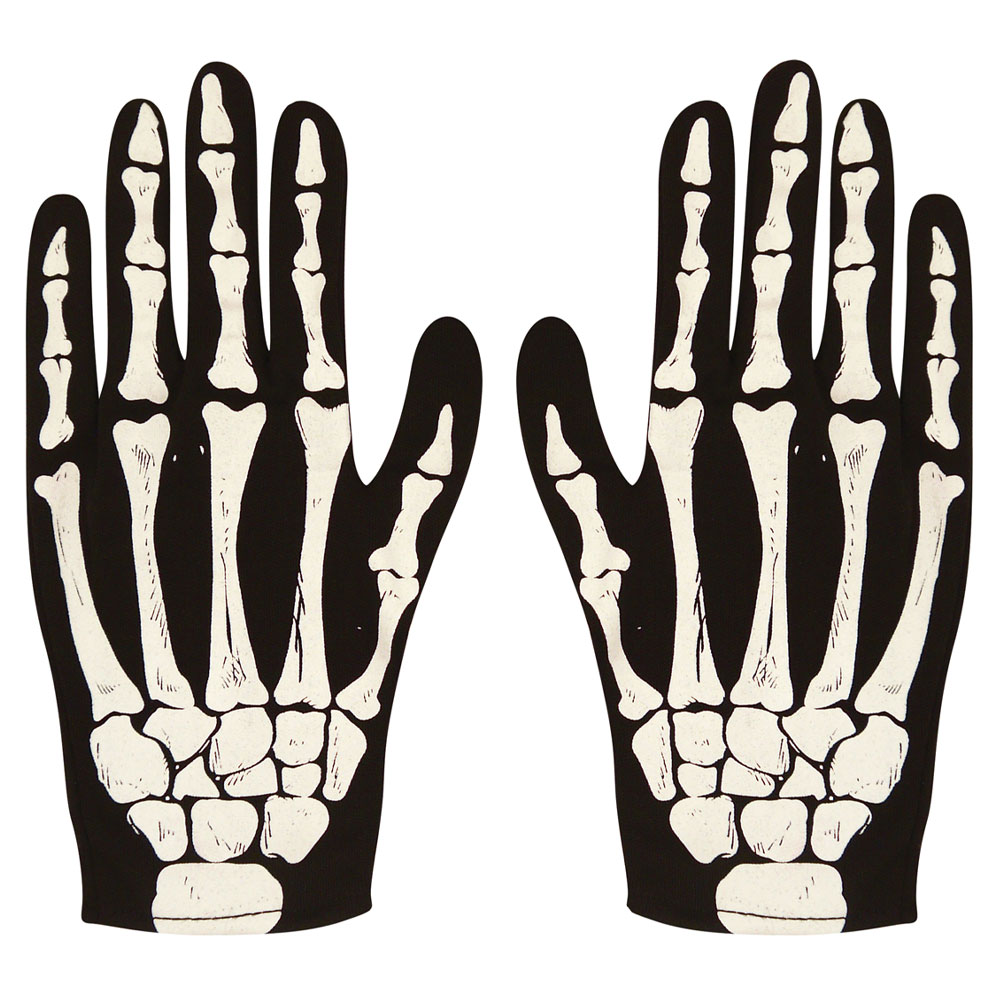 Ska du klä ut dig till skelett inför halloween måste du såklart ha skeletthänder och det kan du enkelt få med dessa häftiga handskar. Svarta handskar med vitt skelettmotiv som blir ett toppenbra tillbehör till din skelett maskerad utklädnad. Passande handskar till flera olika skelettdräkter.