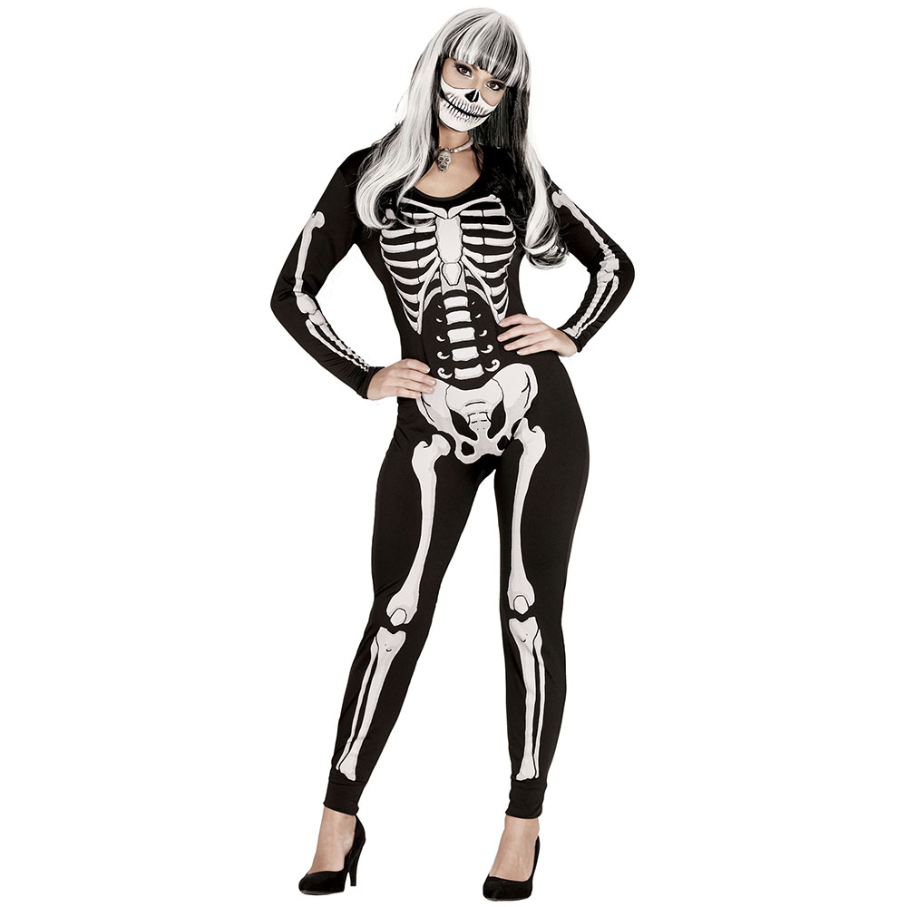 Skelett Jumpsuit består av en svart helkroppsdräkt med vitt skelettmotiv för vuxna. Dräkten är tillverkad av polyester.