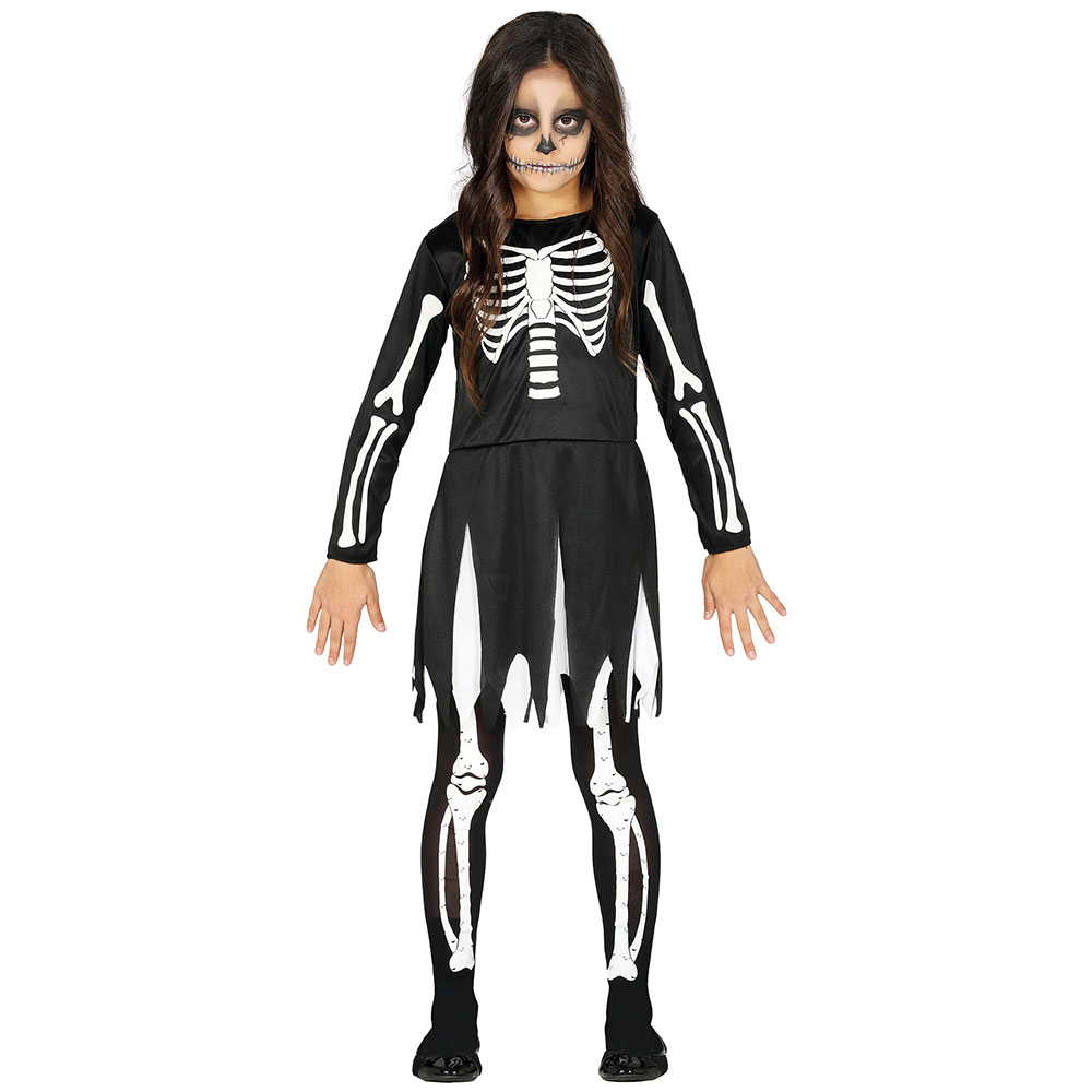 Skelett Klänning Barn omfattar en svart klänning med vitt skelettmotiv.