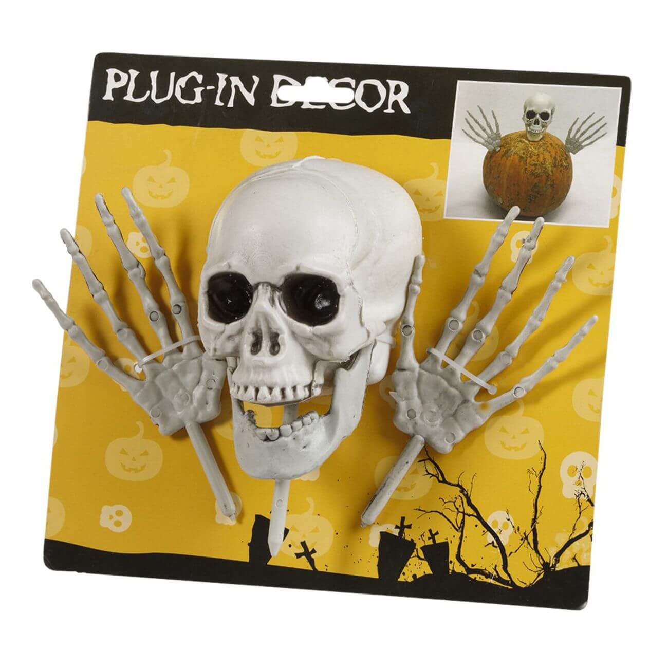 Med det här kitet bestående av ett skeletthuvud och två händer fixar du årets Halloweenpumpa på två röda. Slipp allt karvande och utskörande av pumpan, stick bara in de här i pumpan så har du en skrämmande pumpa. De är gjorda avplast och kan återvändas år efter år.