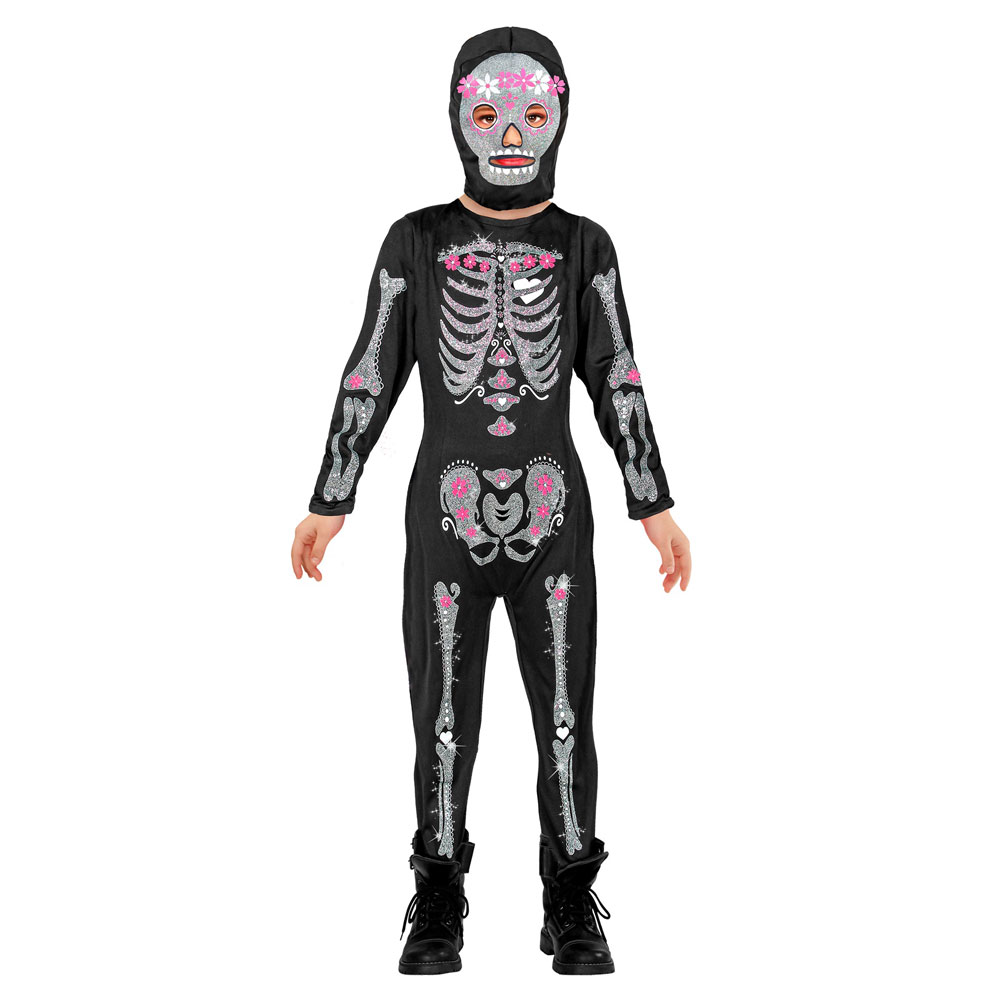 Skelettdräkt Glitter Skeleton Barn omfattar en svart helkroppsdräkt med glittrigt skelettmotiv samt en matchande mask med huva. Dräkten är tillverkad i polyester och passar barn.
