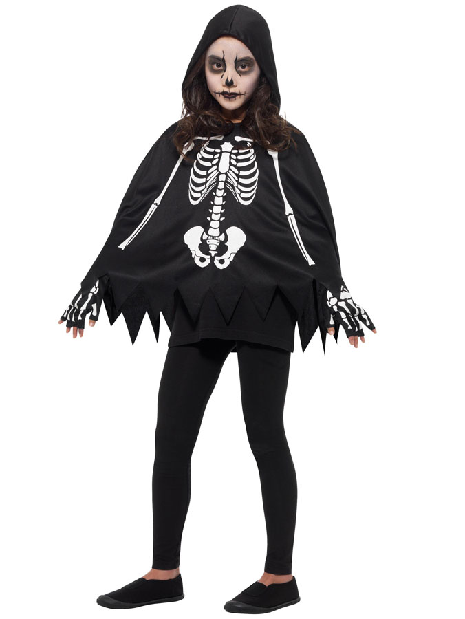 Skelettdräkt med Huva Barn omfattar en svart poncho med en skelettprint på framsidan och en svart huva. Ett par handskar utan fingertoppar ingår med skelettprint på översidan. (Ponchon är gjord i polyester.)