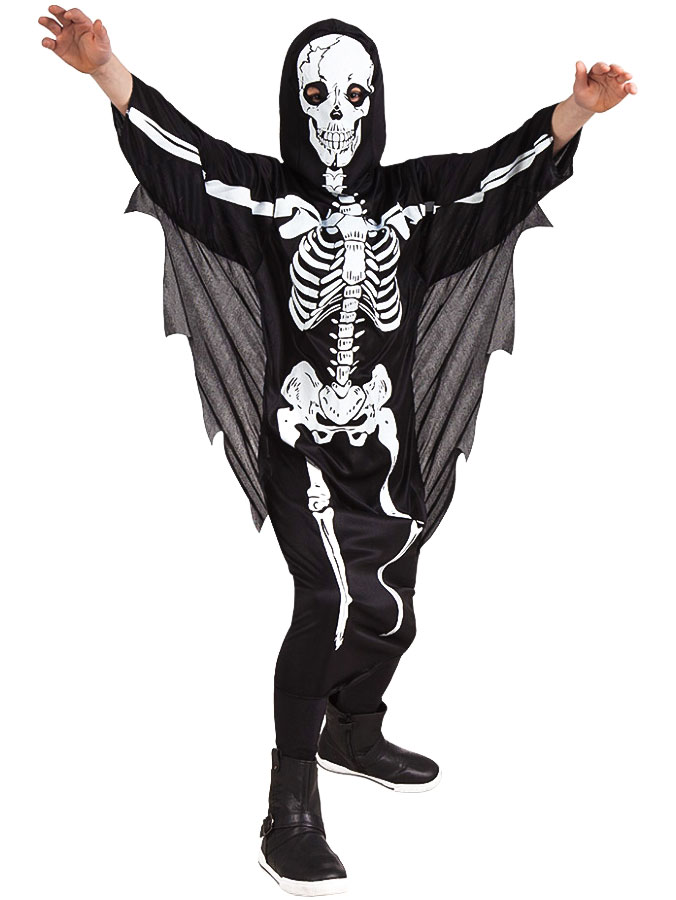 Skelettdräkt med Vingar Barn innehåller en lång svart dräkt med skelettmotiv samt svart vingar som sitter längst ärmarna och sidan av kroppen. Medföljer även en huva med skelettmotiv och hål för ögonen som täcker hela huvudet.