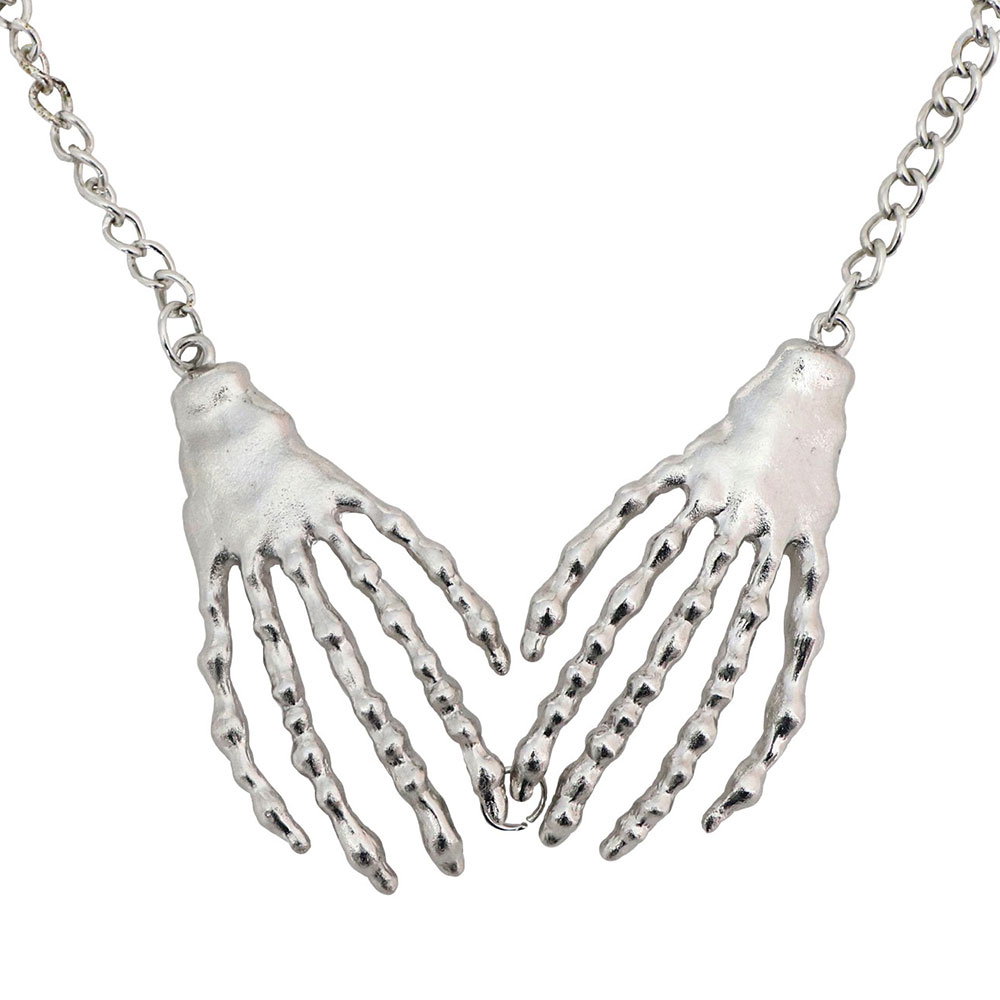 Skeletthänder Halsband Silver omfattar ett silverfärgat halsband med två skeletthänder.