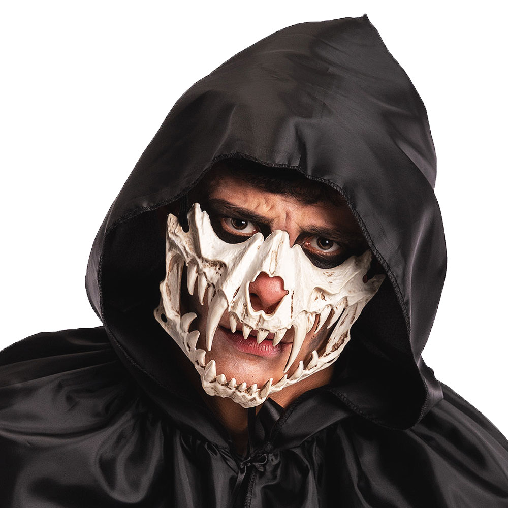 Skelettmask Käke omfattar en formgjuten mask föreställandes en käke med huggtänder. Masken är en halvmask och har ett resårband för att fästa runt huvudet.