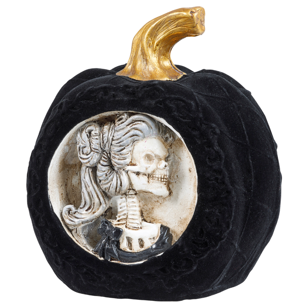 Skelettpumpa Sammet Svart omfattar en pumpadekoration i stenliknande material med svart sammet, guldknopp och ingröpt motiv av ett skelett med långt hår.