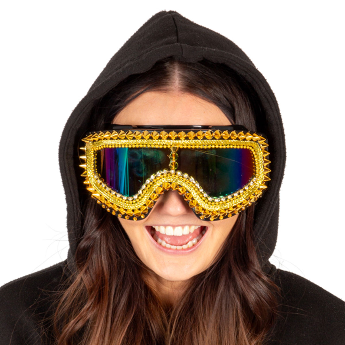 Skidglasögon Guld omfattar ett par skidglasögon med en lins som skiftar i regnbågens alla färger och svarta bågar dekorerade med guldfärgade nitar och paljetter. Glasögonen hålls på plats med ett justerbart elastiskt svart band.