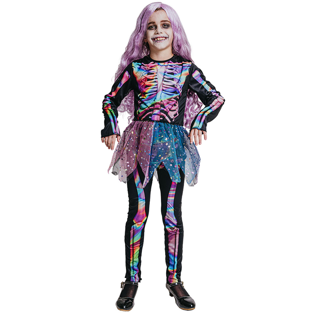 Skimrande Skelettdräkt omfattar en jumpsuit med skelettmotiv i regnbågsfärger och lila samt en kjol i nättyg där halva är blå och halva är lila och täcks av skimrande stjärnor.