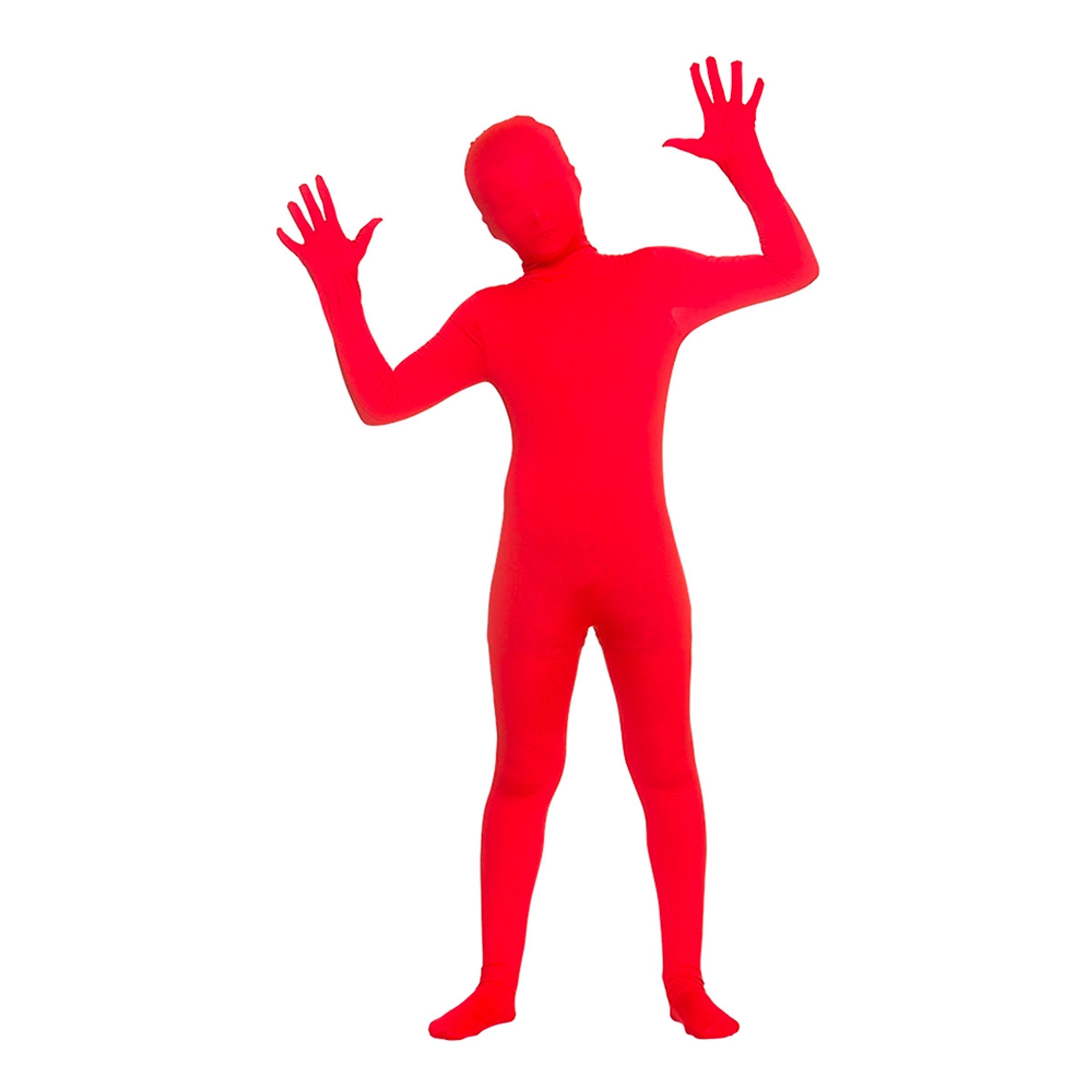 Skinz Röd Barn Maskeraddräkt är en stretchig, åtsittande röd helkroppsdräkt med huva som går att fälla ner vid ansiktet. Baktill på huvan finns kardborreband så barnet enkelt kan dra ner huvan och fästa den igen. Dräkten täcker både fötter och händer, och är tunnare vid ansiktet så barnet kan andas och se igenom tyget (med begränsad sikt).