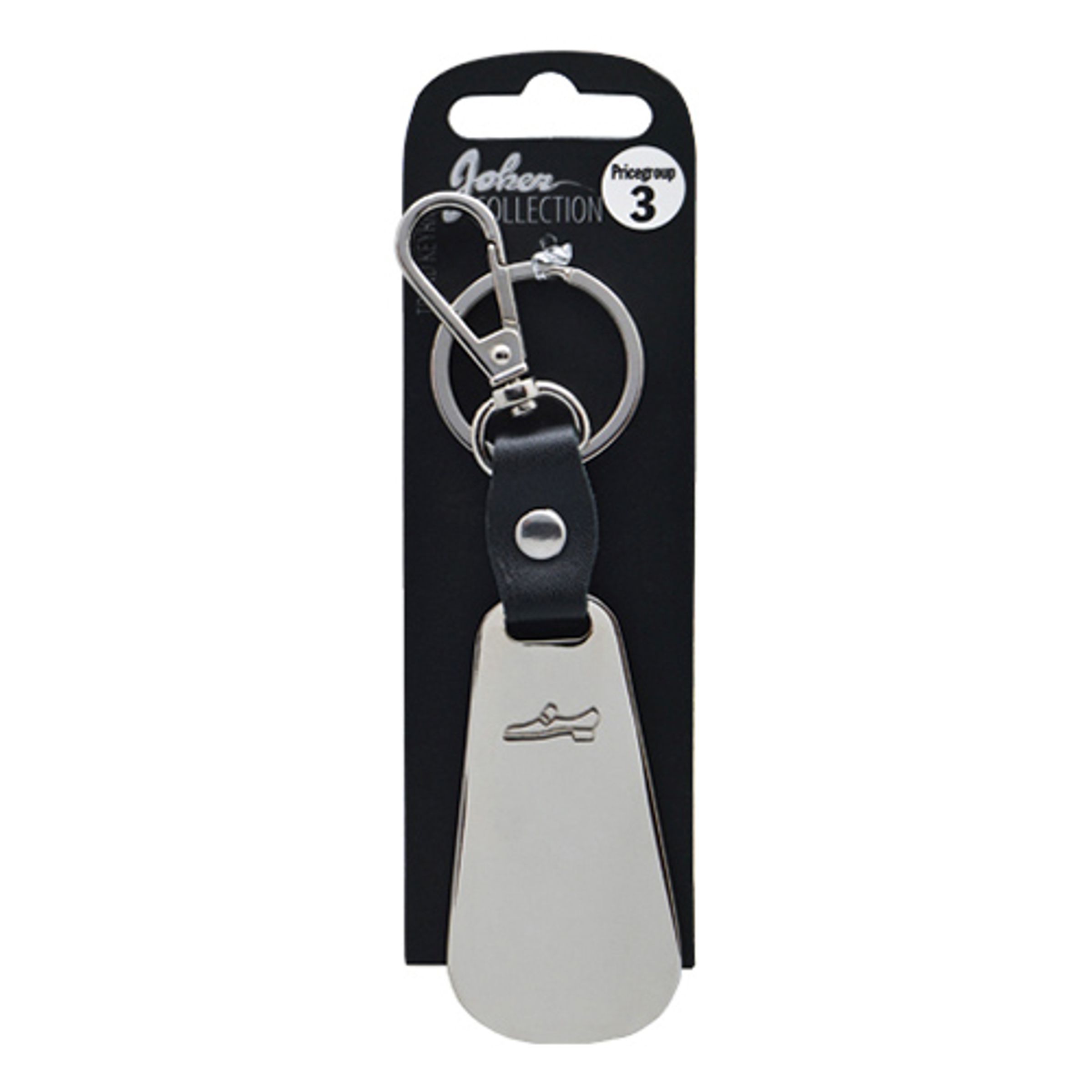 Nyckelring i stål med läderimitation och ett skohorn i rostfritt stål. Levereras med karbinhake och nyckelring som du enkelt kan fästa på dina nycklar.