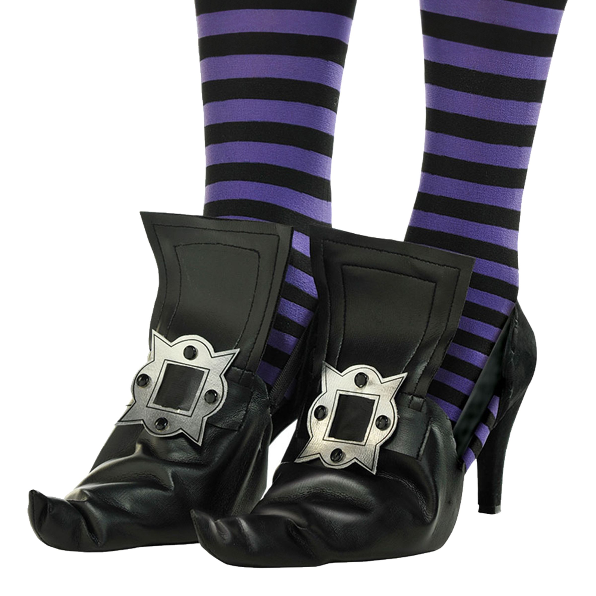 Skoöverdrag Häxa för Barn inkluderar ett par skoöverdrag i konstläder som har en spetsig, upprullad tå och ett vinylspinnespänne fäst vid ett elastiskt elastiskt band. De glider lätt på över vanliga skor!