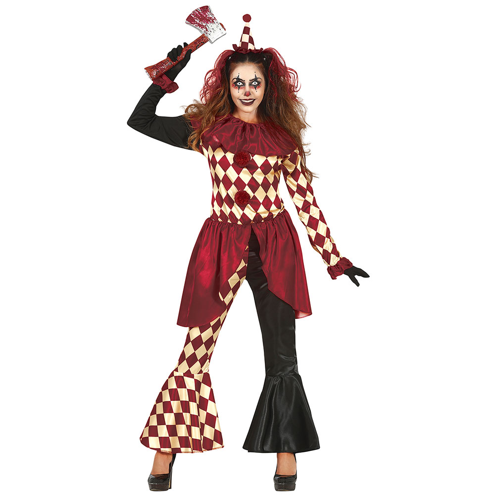 Skräckclown Maskeraddräkt Dam omfattar en clown maskeraddräkt med en röd krage, en lång blus i svart, röd och krämgul, samt matchande byxor.