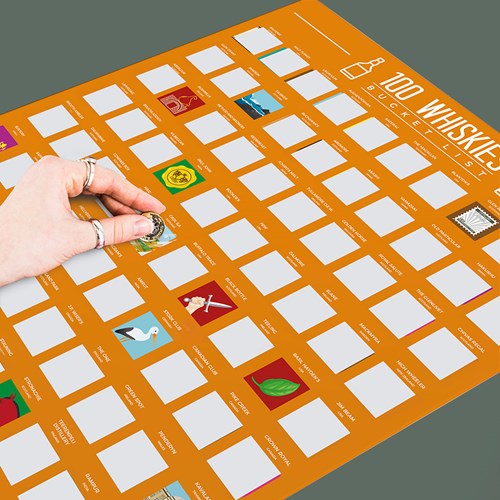 Smaka dig igenom olika sorters whisky och skrapa en ruta för varje smak! Denna interaktiva poster är en bucket list med 100 goda whiskysorter och lika många folierutor att skrapa. Över varje folieruta står namnet och landet där whiskyn produceras. På denna skrapaffisch hittar du till exempel Redbreast whiskey från Irland, Few bourbon från USA, Paul John whisky från Indien och Sapporo whisky från Japan.