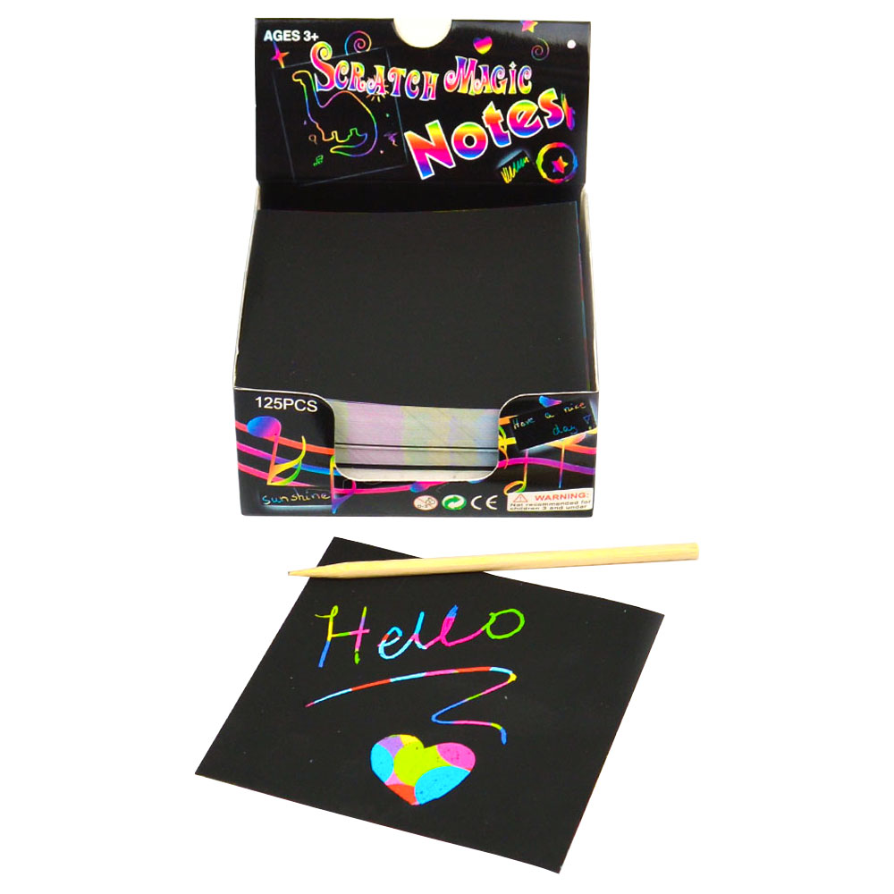 Skrapkort Regnbåge omfattar 125 stycken svarta skrapkort med regnbågsfärger. Skrapa försiktigt på skrapkorten med den medföljande skrappinnen för att skapa häftiga effekter. Korten är tillverkade av papp och är ca 9 x 9 cm stora.