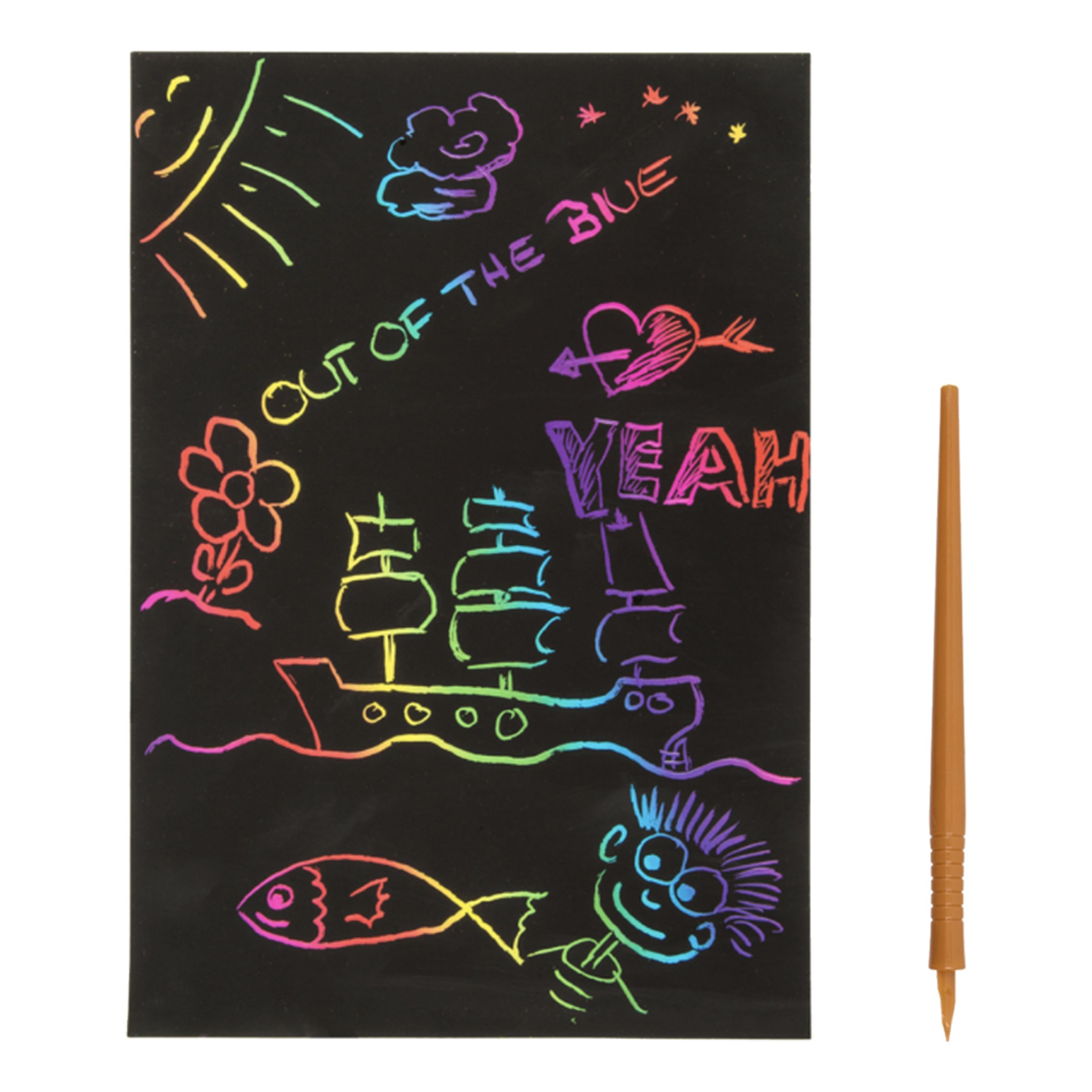 Det här är ett perfekt pyssel att ta med på en lång bilresa eller när du ska gå ut och äta på restaurang med barnen! Med hjälp av skrappennan kan man nämligen skapa fram massor av häftiga mönster eller skriva olika meddelanden. Pysselsetet är också en kul gåva att ge till ett födelsedagsbarn!