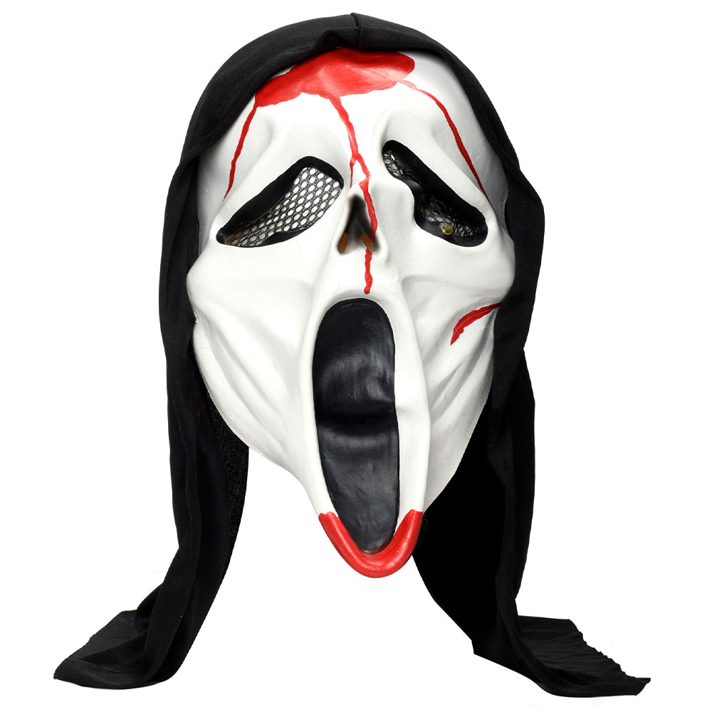 – Ansiktsmask som påminner om karaktären Ghostface, med svart slöja baktill.