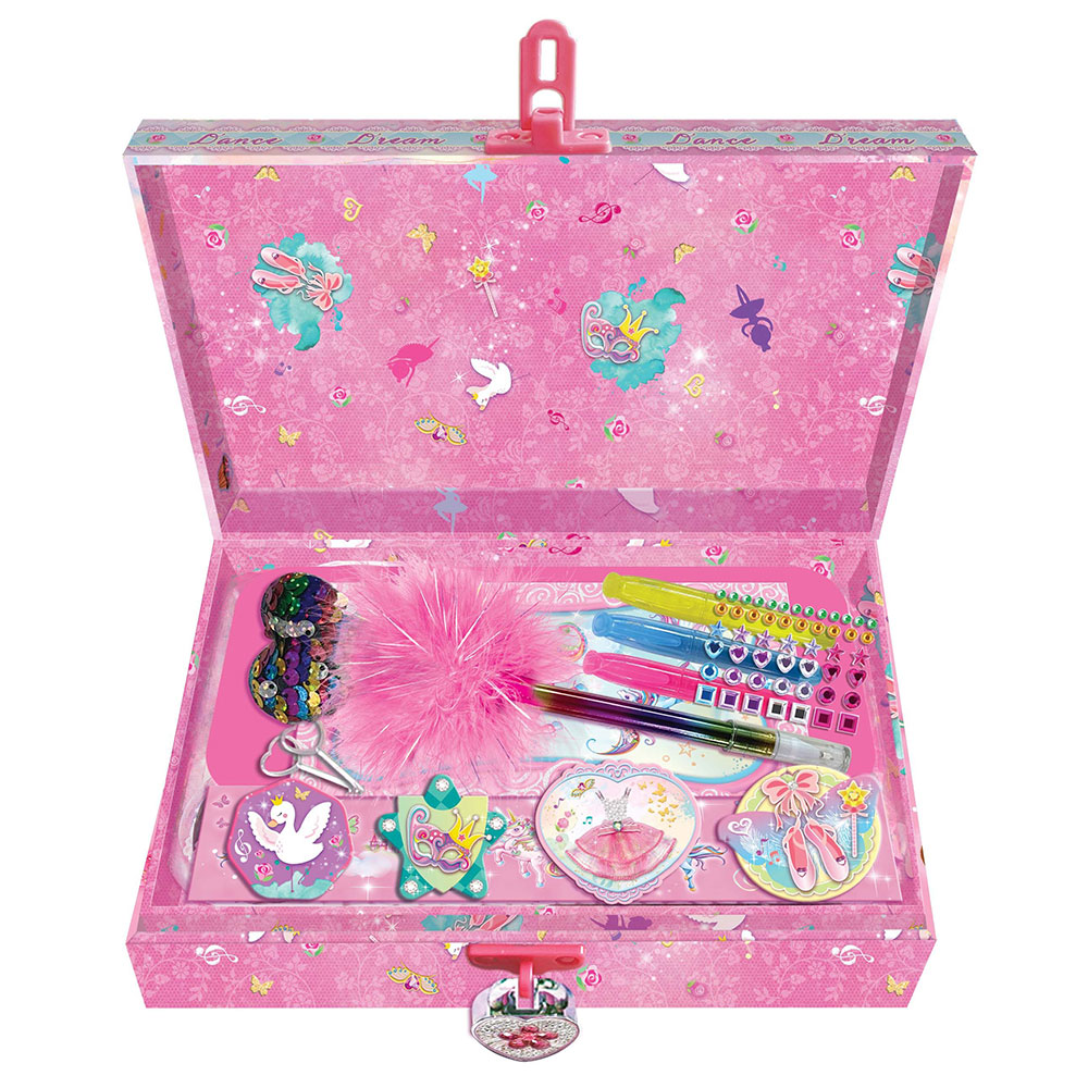 Ge kreativiteten vingar med detta charmiga skrin med lås för barn, vars innehåll förvandlar varje skrivstund till en magisk stund. Detta skrivset för barn bjuder in till timmar av skapande med dess unika ballerina-inspirerade tema och färgsprakande verktyg.