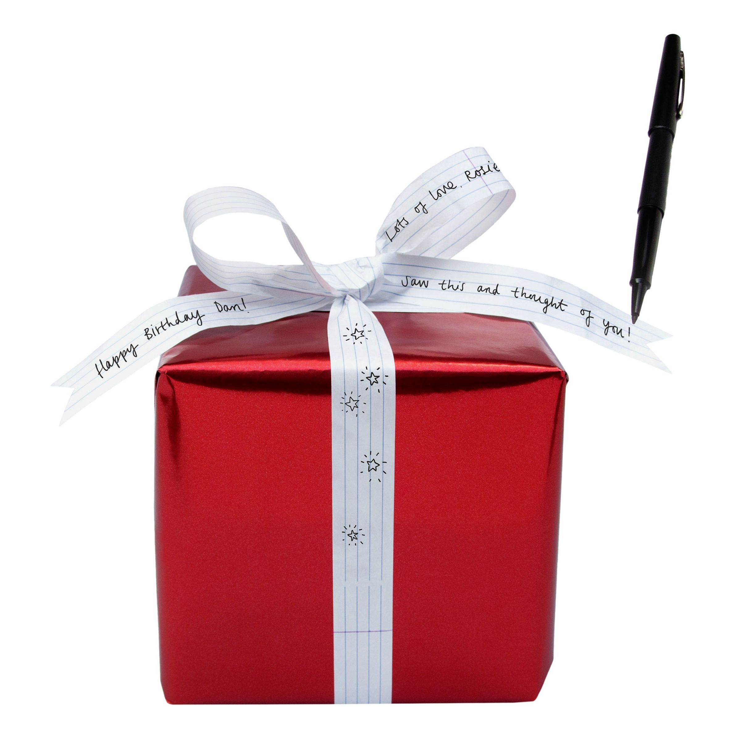 Skrivbart Presentband är ett rivsäkert presentband som låter dig skriva egna meddelanden på. Presentbandet kommer streckat vilket gör det enkelt att få till en snyggare handstil. Perfekt till födelsedagar, bröllop och andra firanden!