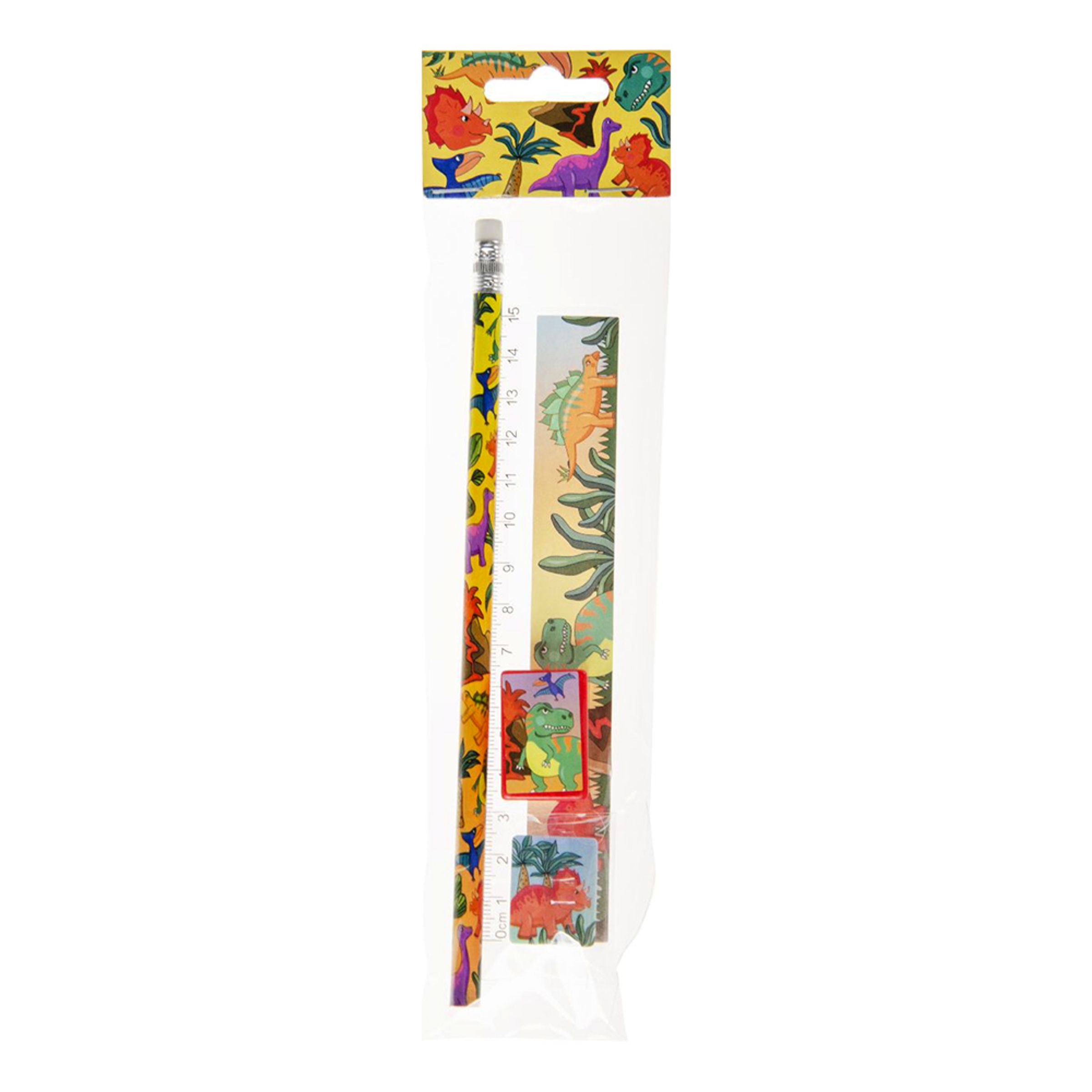 Skrivset Dinosaurie inkluderar ett komplett kit med penna, linjal, pennvässare och suddgummi som samtliga kommer med motiv av dinosaurier. Perfekt till barnet inför skolstarten!