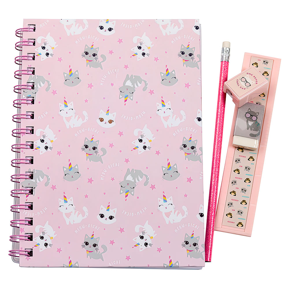 Superfint skrivset med enhörningskatter, perfekt för alla barn som gillar enhörningar och katter. Detta skriv set med anteckningsblock, penna, sudd, pennvässare och linjal har allt som behövs för ditt barn att komma igång med pyssel, skrivande och räknande såväl hemma som i skolan, ett skrivset som kan åtstadkomma nästan magiska ting.