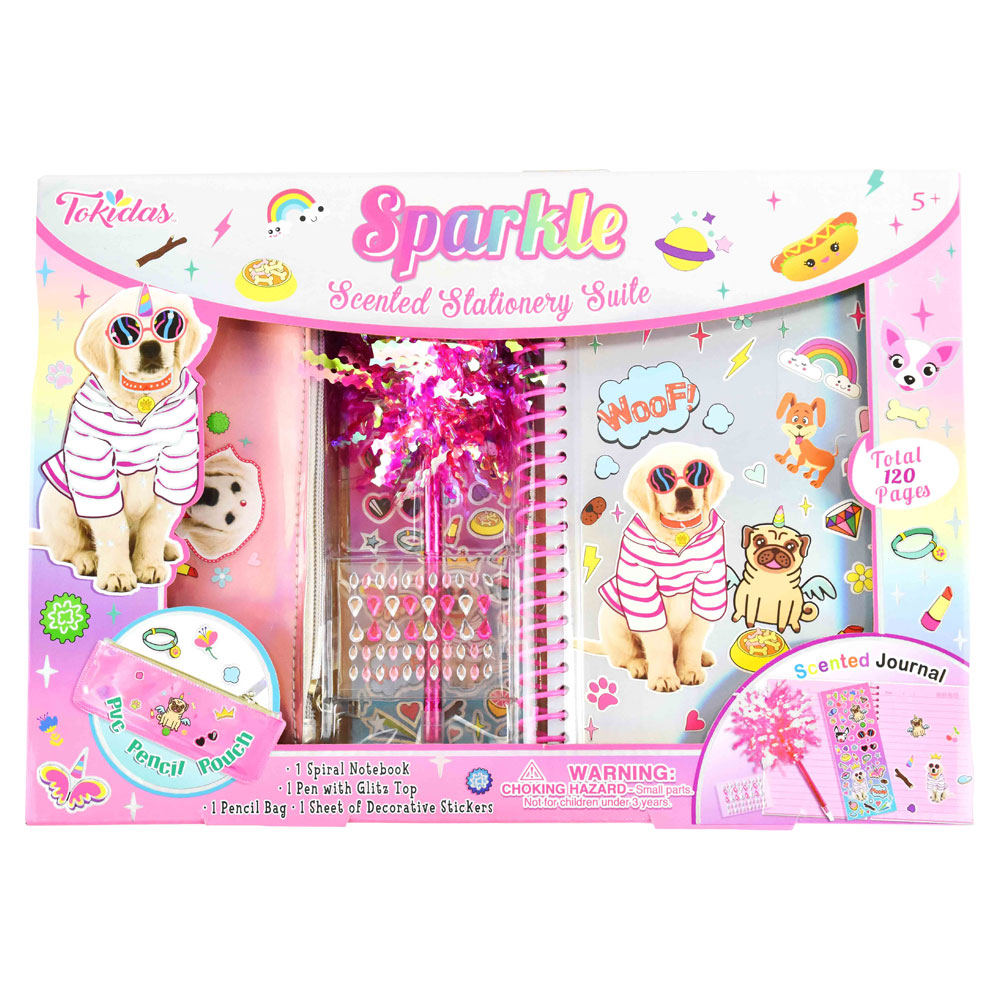 Skrivset med Doft omfattar ett skrivset för barn på 5 år och uppåt. Setet innehåller en anteckningsbok med doft, en bläckpenna med glittrande detalj upptill och ett pennfodral samt ett ark klistermärken.