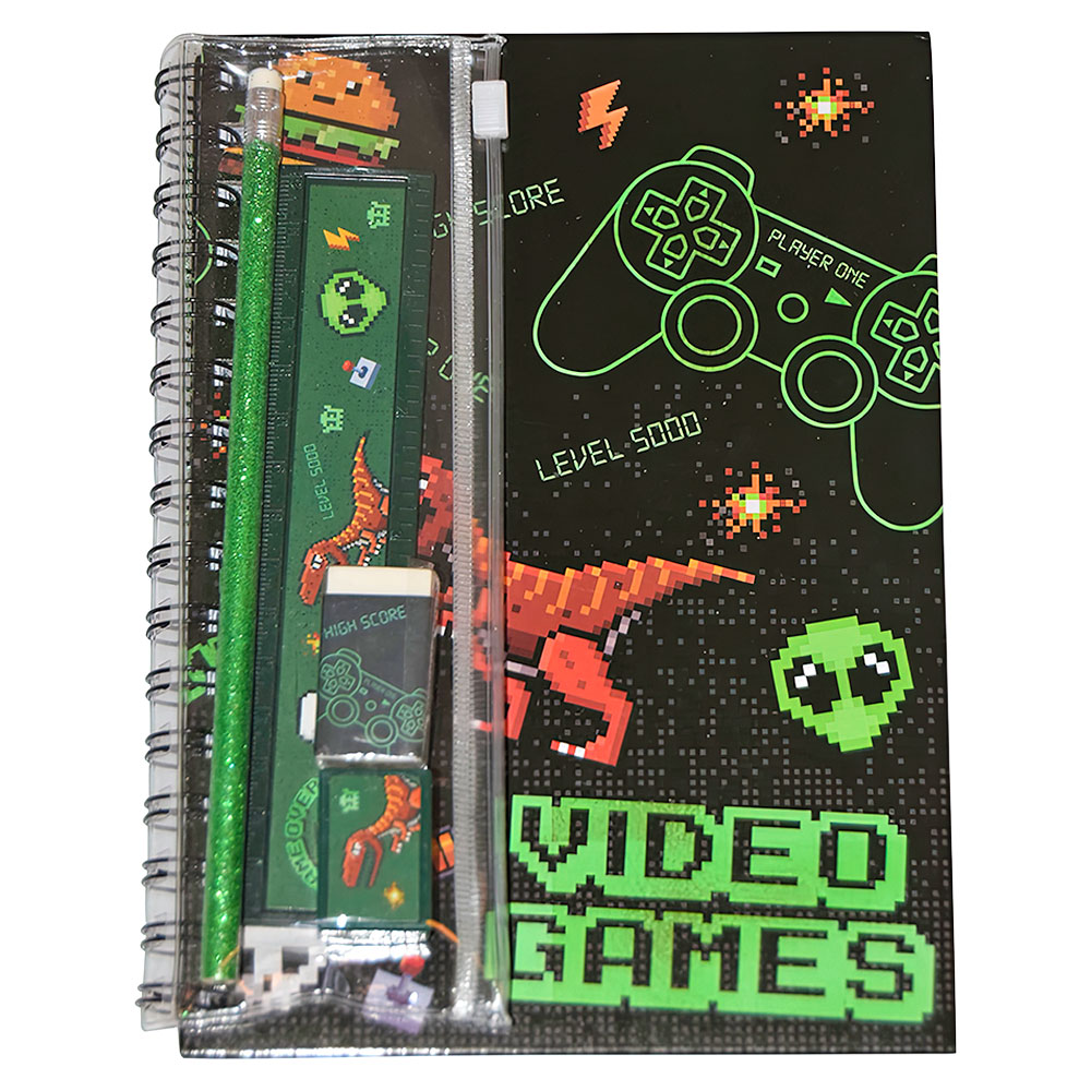 Skrivset Video Games omfattar ett skrivset i svart med spiralblock med linjerade sidor, sudd, blyertspenna, linjal, pennvässare och enklare transparent plastfodral med TV-spels motiv i grönt och orange med texten "Video Games".