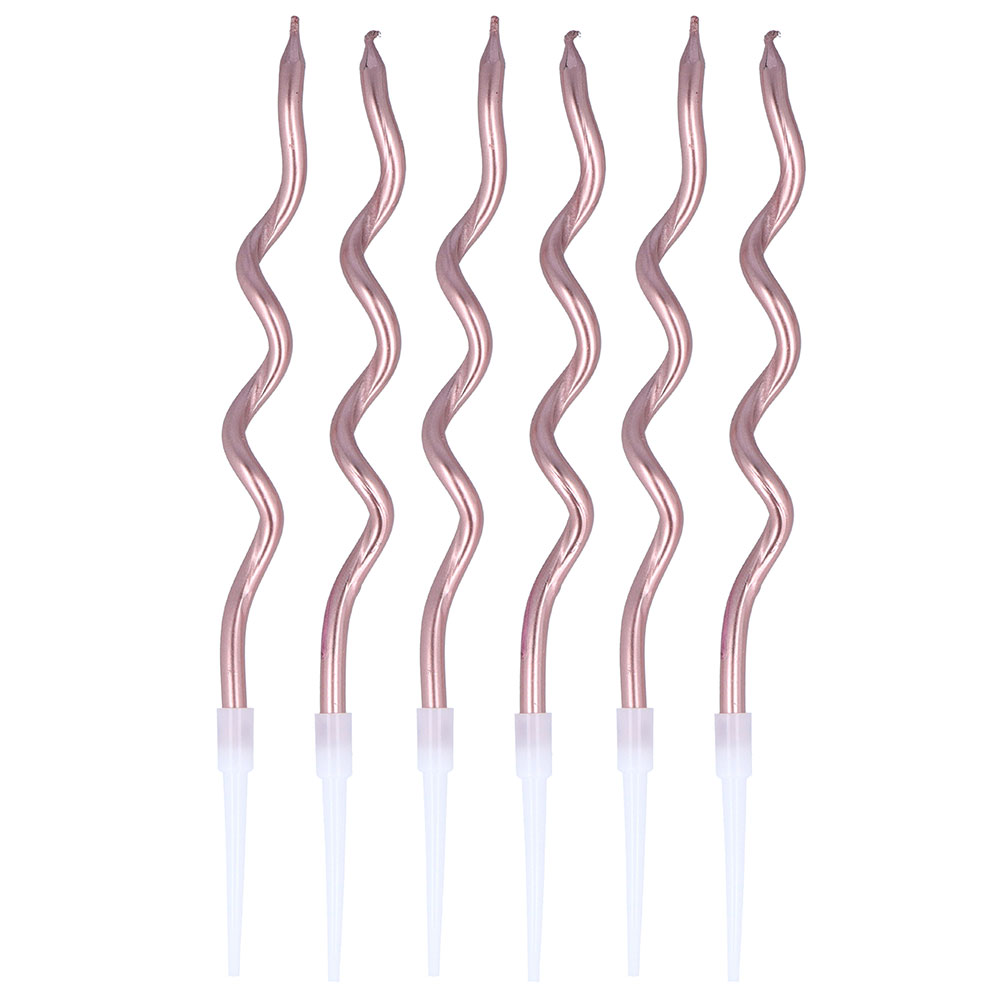 Skruvade Tårtljus Roséguld omfattar en förpackning med 6 st smala, skruvade tårtljus i roséguld. Kommer även med vita ljushållare i plast.