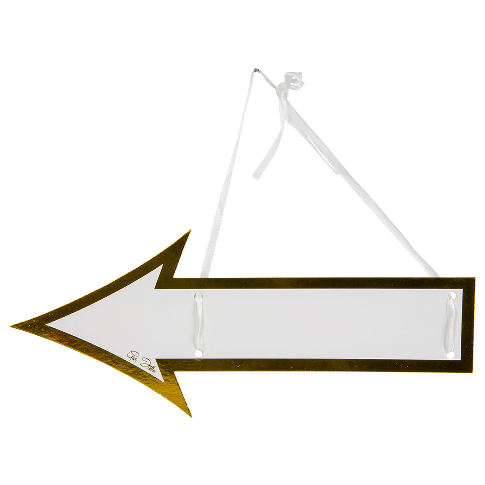 Skyltar Pilar omfattar 2 st vita skyltar i form av pilar med guldiga kanter. Skyltarna är ca 15 cm höga och 25 cm långa, och kommer även med vita band att hänga upp dem med. Tillverkade av papp.