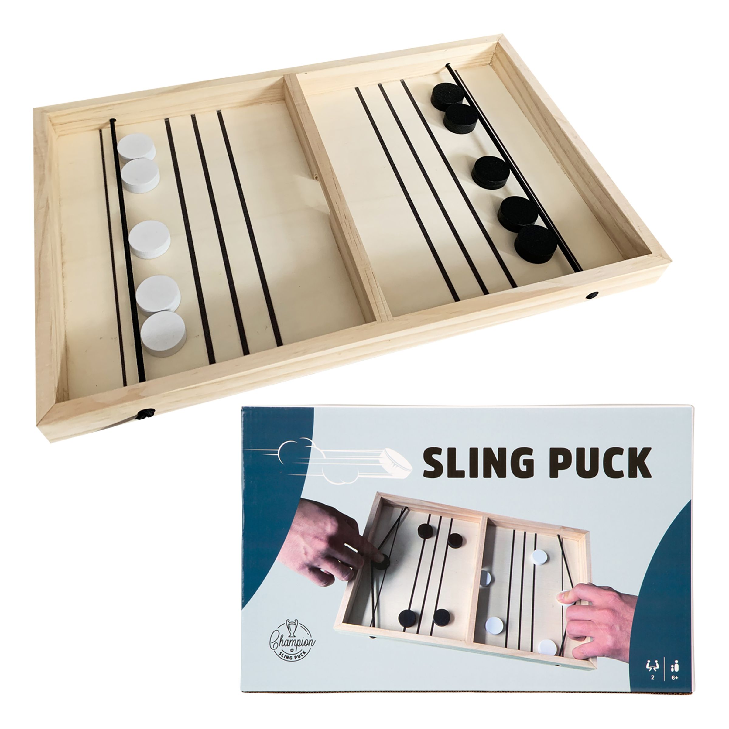 Sling Puck Brädspel är ett enkelt spel som passar både vuxna och barn. Spelet går ut på att få över puckarna på motståndarens spelplan genom det lilla hålet i mitten.