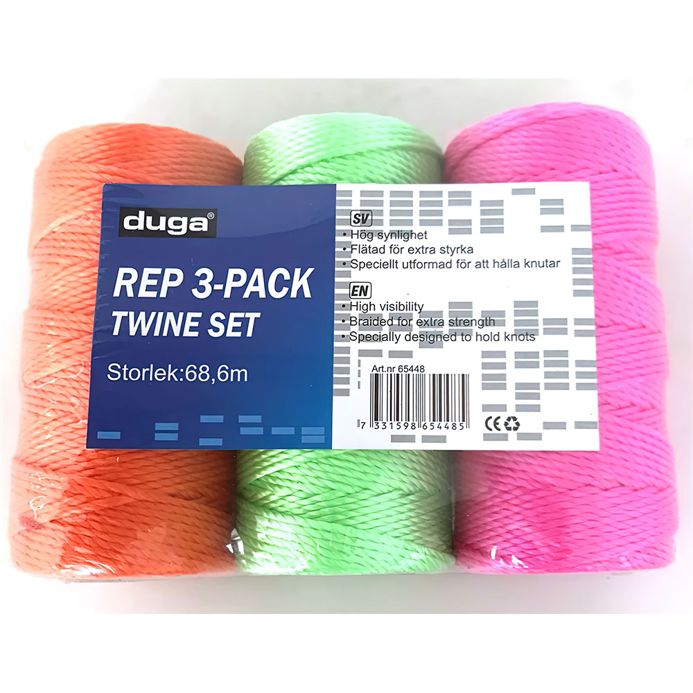 Slitstarkt Snöre 3-Pack omfattar tre stycken rullar snöre med hög synlighet tack vare de starka färgerna i orange, grön och rosa. Snörena håller knutar bra. Längden är ungefär 68 meter per rulle.