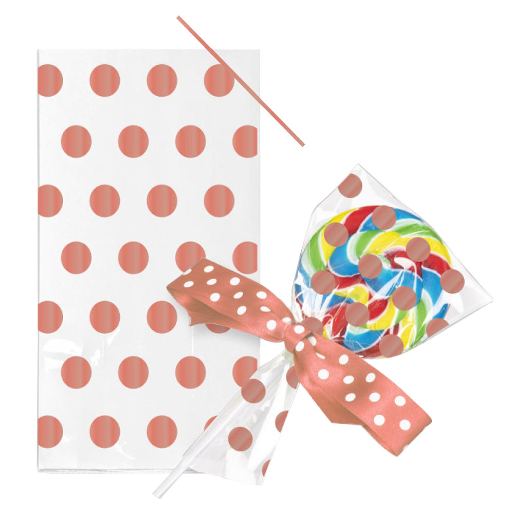 Små Cellofanpåsar Polka Dot Roseguld omfattar ett 20-pack genomskinliga cellofanpåsar med roseguldiga prickar för godisklubbor eller kakor. Påsarna är tillverkade av plast och är 18 cm höga samt 10,2 cm breda. Medföljer även små knytband att stänga ihop påsarna med.