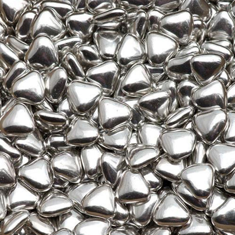 Riktigt fina och framför allt goda godis hjärtan i vackert skimrande silver som är ett utmärkt val för dig som vill bjuda gästerna på elegant choklad godis. Bjud på dessa chokladhjärtan precis som de är eller använd dem för att snyggt dekorera en tårta, muffins eller annan likande bakelse.