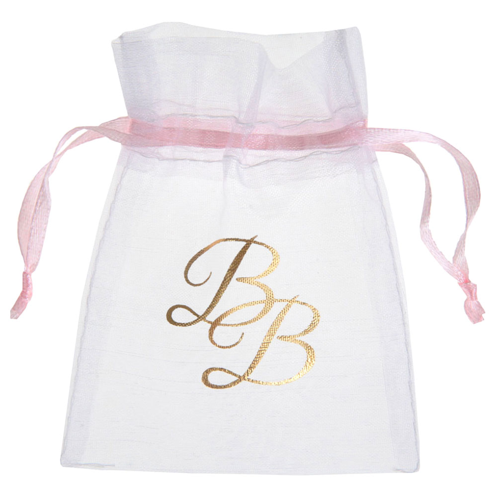 Små Organzapåsar BB Rosa omfattar 6 stycken vita organzapåsar med rosa dragsnören och guldig "BB" text. Påsarna är tillverkade av polyester och är ca 10 cm höga samt 7 cm breda.