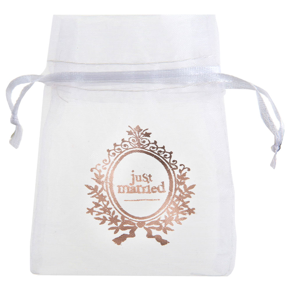 Fina små organzapåsar med skimrande "Just Married" text som gör dem till perfekta små presentpåsar till bröllop. Fyll de små påsarna med valfritt innehåll och dela ut dem till alla gäster eller duka upp dem på bröllopsbordet. Ett utmärkt val för dig som vill överraska bröllopsgästerna med små gåvor.