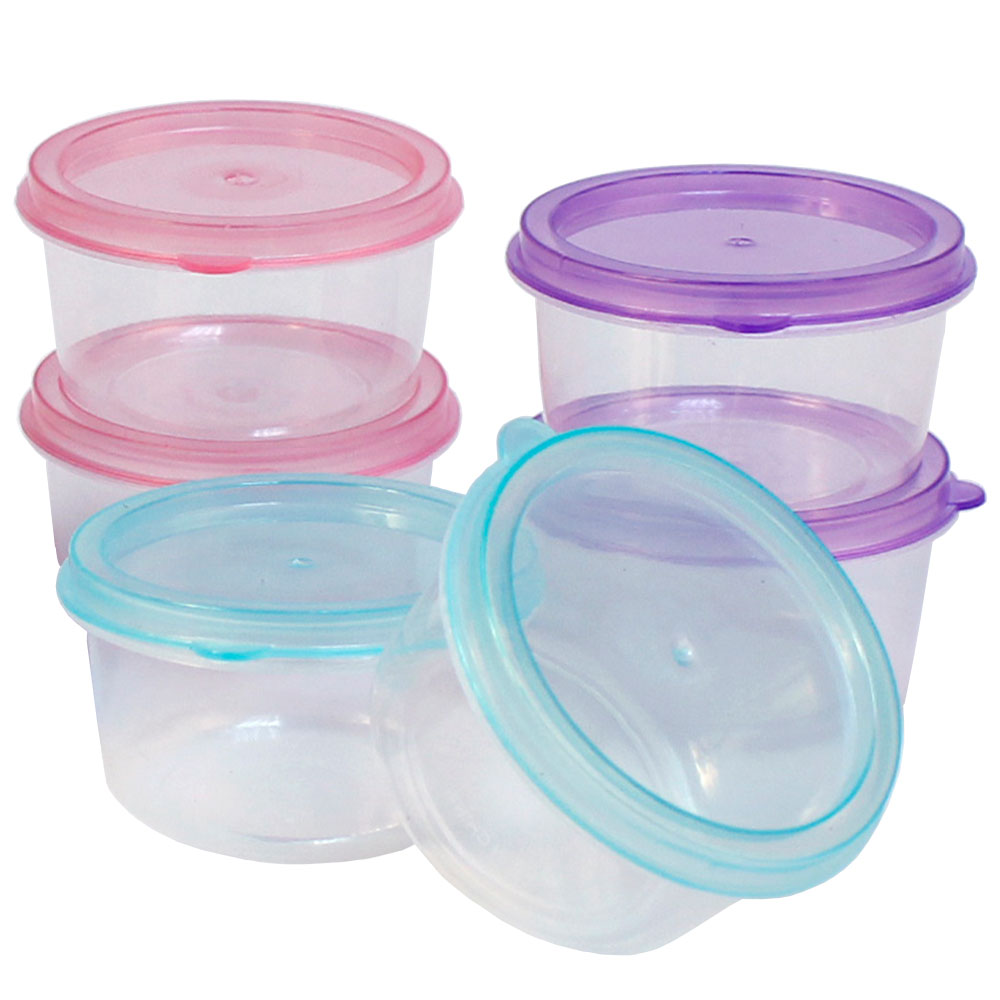 Små Runda Plastburkar 6-Pack omfattar sex stycken små plastburkar med lock. Locken kommer i färgerna rosa, lila och turkos.