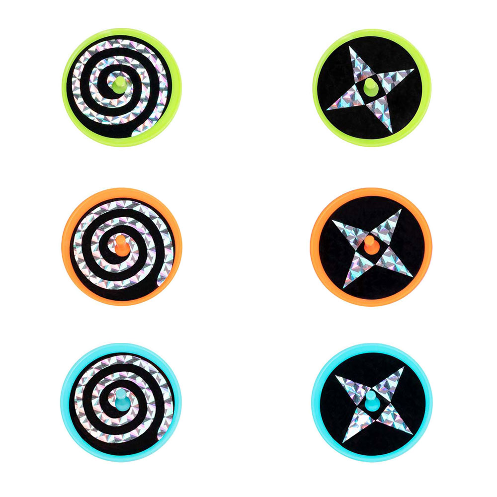 Små Spinning Tops Set omfattar 6 stycken små spinning tops i olika neonfärger med svart mönster. Snurrorna är ca 3 cm i diameter.