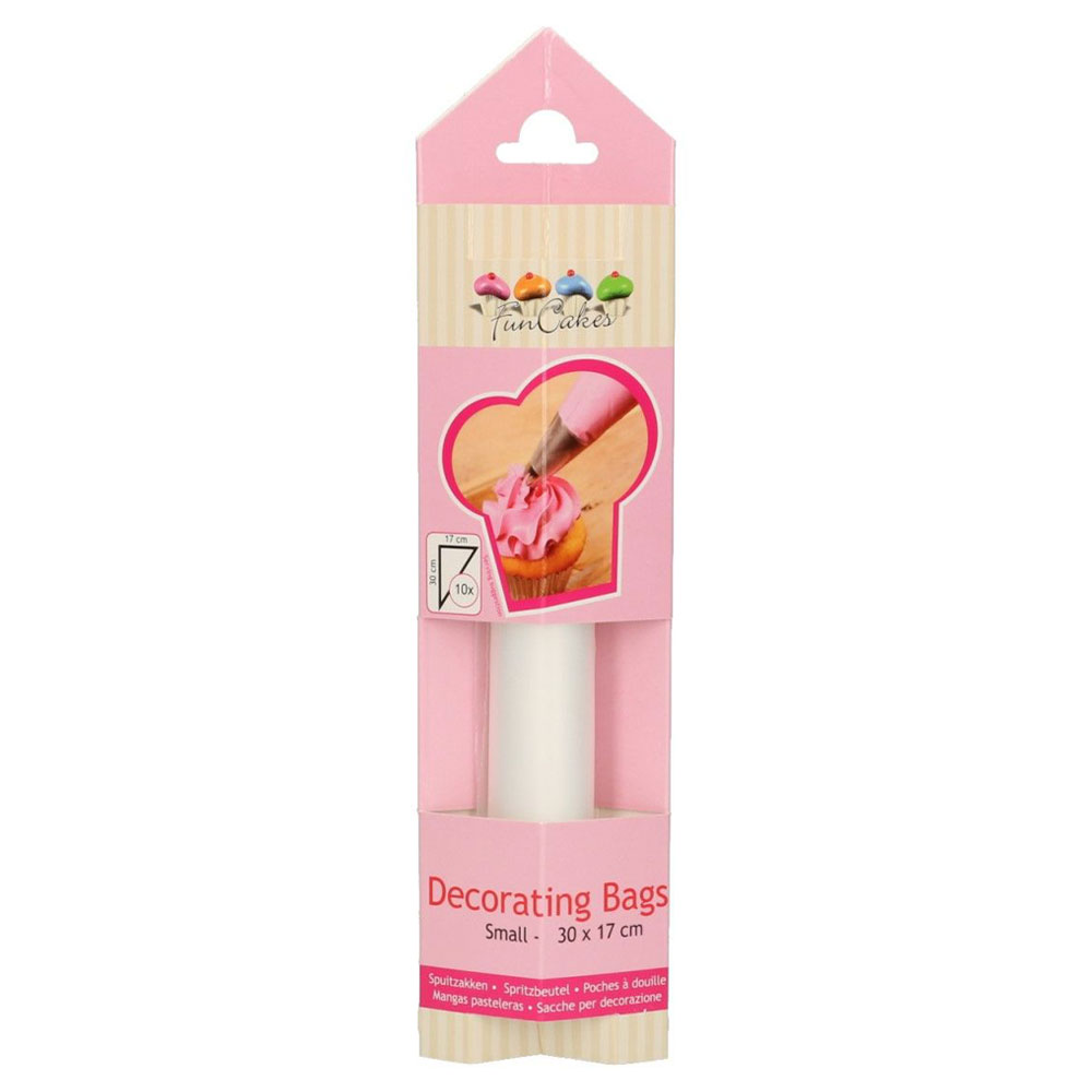 Små Spritspåsar 10-pack omfattar 10 stycken transparenta engångspritspåsar av flexibelt non-slip plast för kalla, varma, tjocka och tunna fyllningar. Påsarna är ca 30 cm långa och 17 cm breda. Kan fyllas i förväg och förvaras i kylskåp och värmas upp i micron.