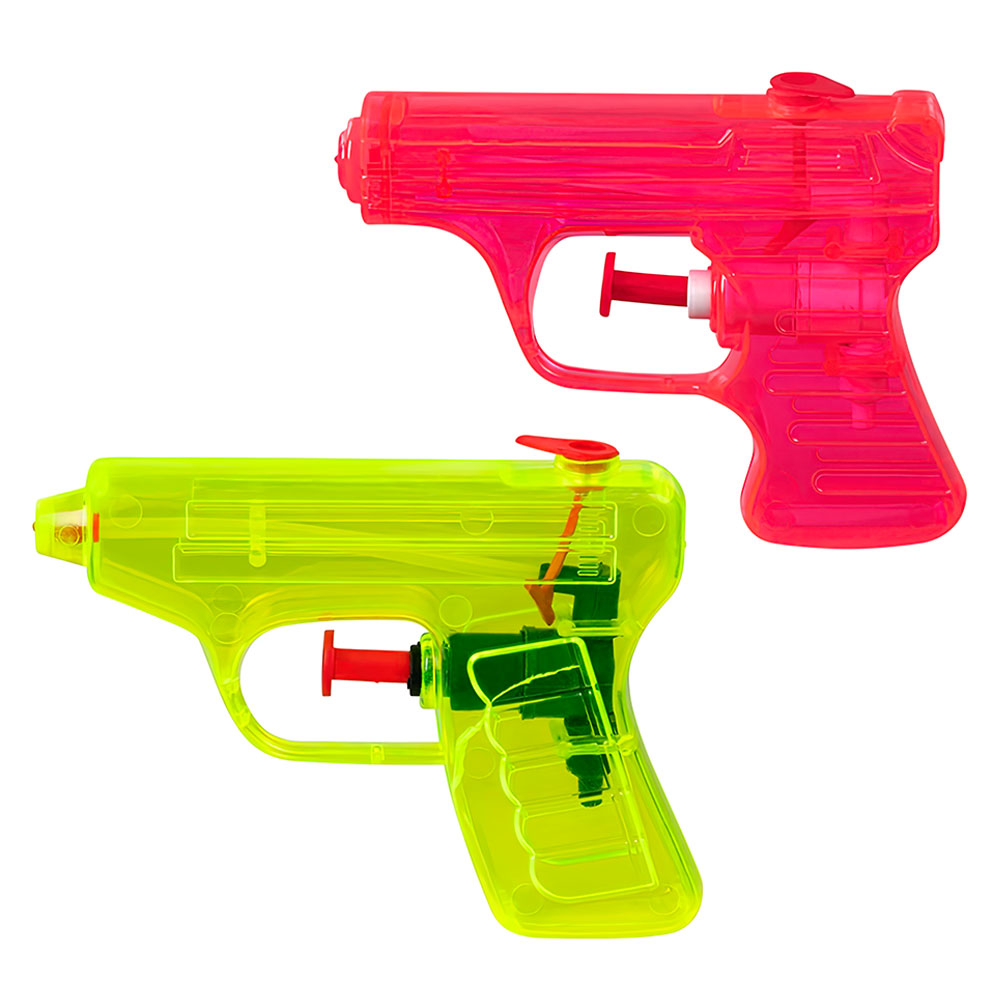 Små Vattenpistoler omfattar två stycken små vattenpistoler i plast, en i transparent gult och en i transparent rosa. Vattenpistolerna är ca 7,5 cm höga och 10 cm långa.