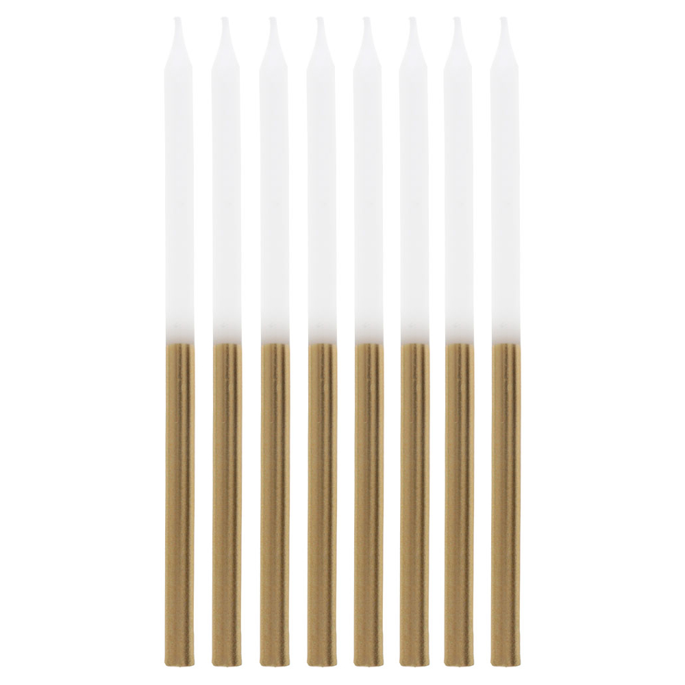 Smala Tårtljus Guld/Vit omfattar ett 12-pack smala tårtljus i vitt och skimrande guld. Tårtljusen är ca 12,5 cm långa och kommer med praktiska små ljushållare som gör det enkelt att sticka ner dem i tårtan.