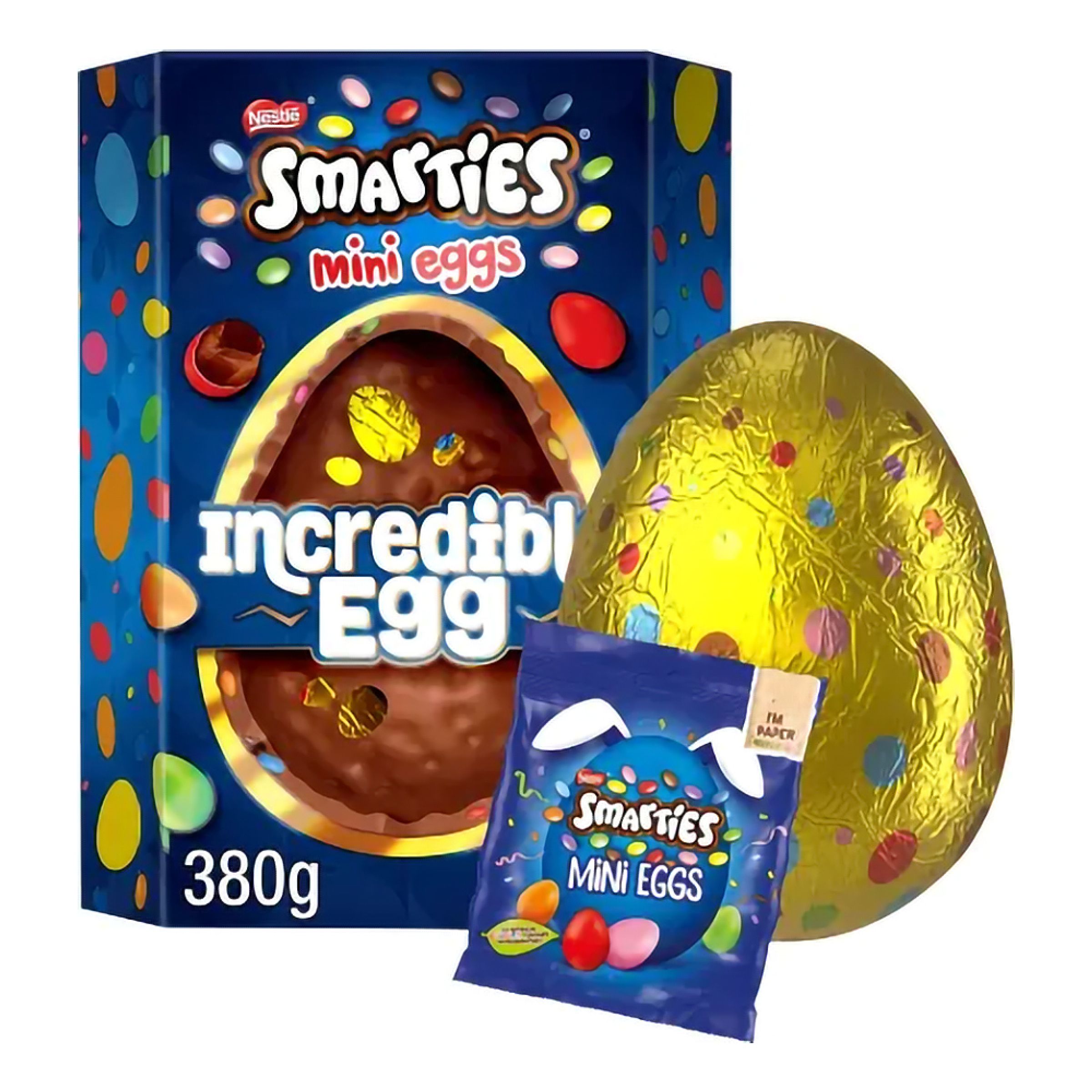 Smarties Milk Chocolate Incredible Easter Egg är ett gigantiskt påskägg med mini-Smarties inbakade i det släta chokladskalet. I förpackningen ingår även en påse Smarties Mini Eggs.