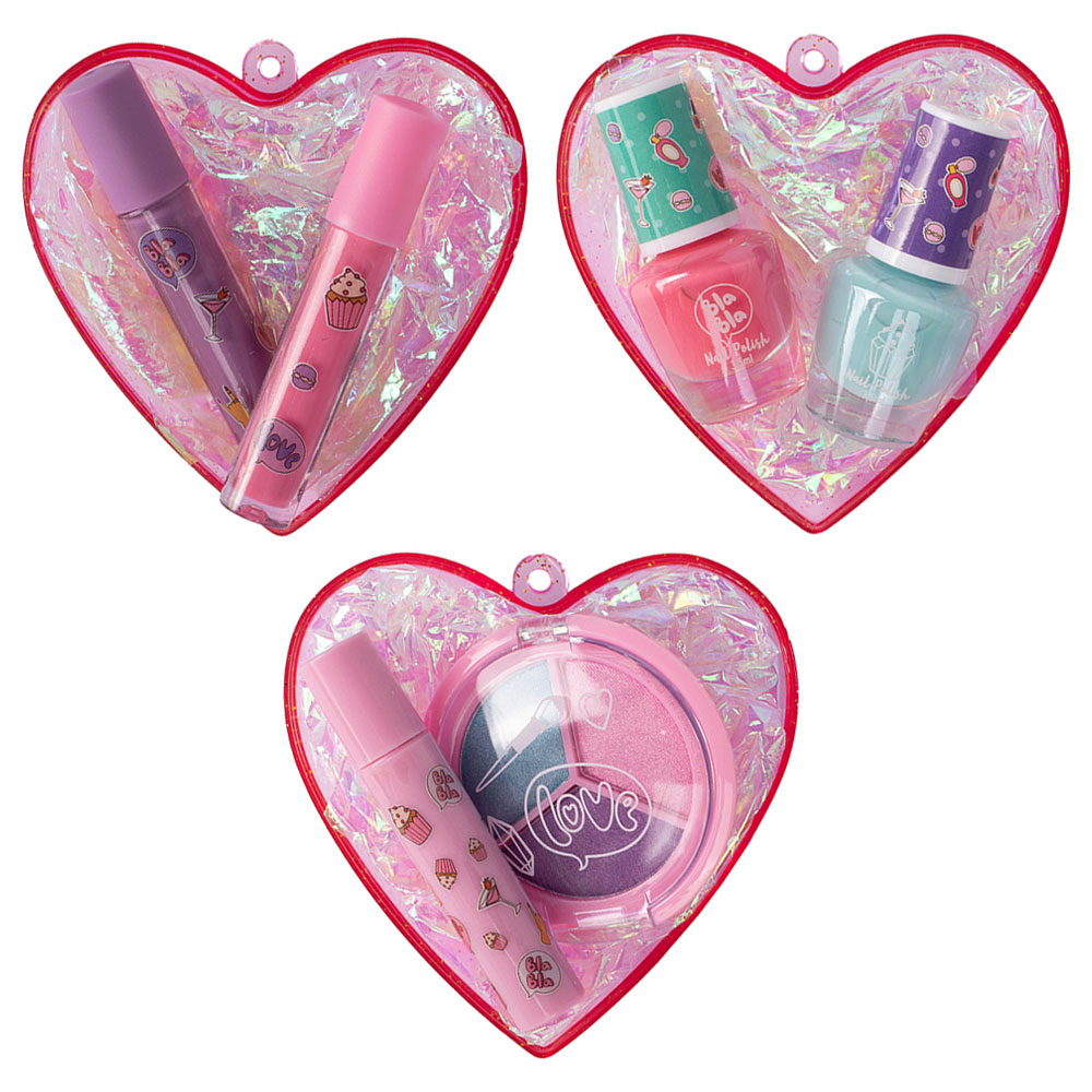 Smink i Hjärta 2-pack omfattar en transparent rosa hjärtformad burk med antingen två nagellack på 5 ml/st i pastellfärgerna rosa och turkos, två läppglans på 1 ml i rosa och lila, eller en mascara på 1 ml och en ögonskuggspalett med färgerna rosa, lila och blå.